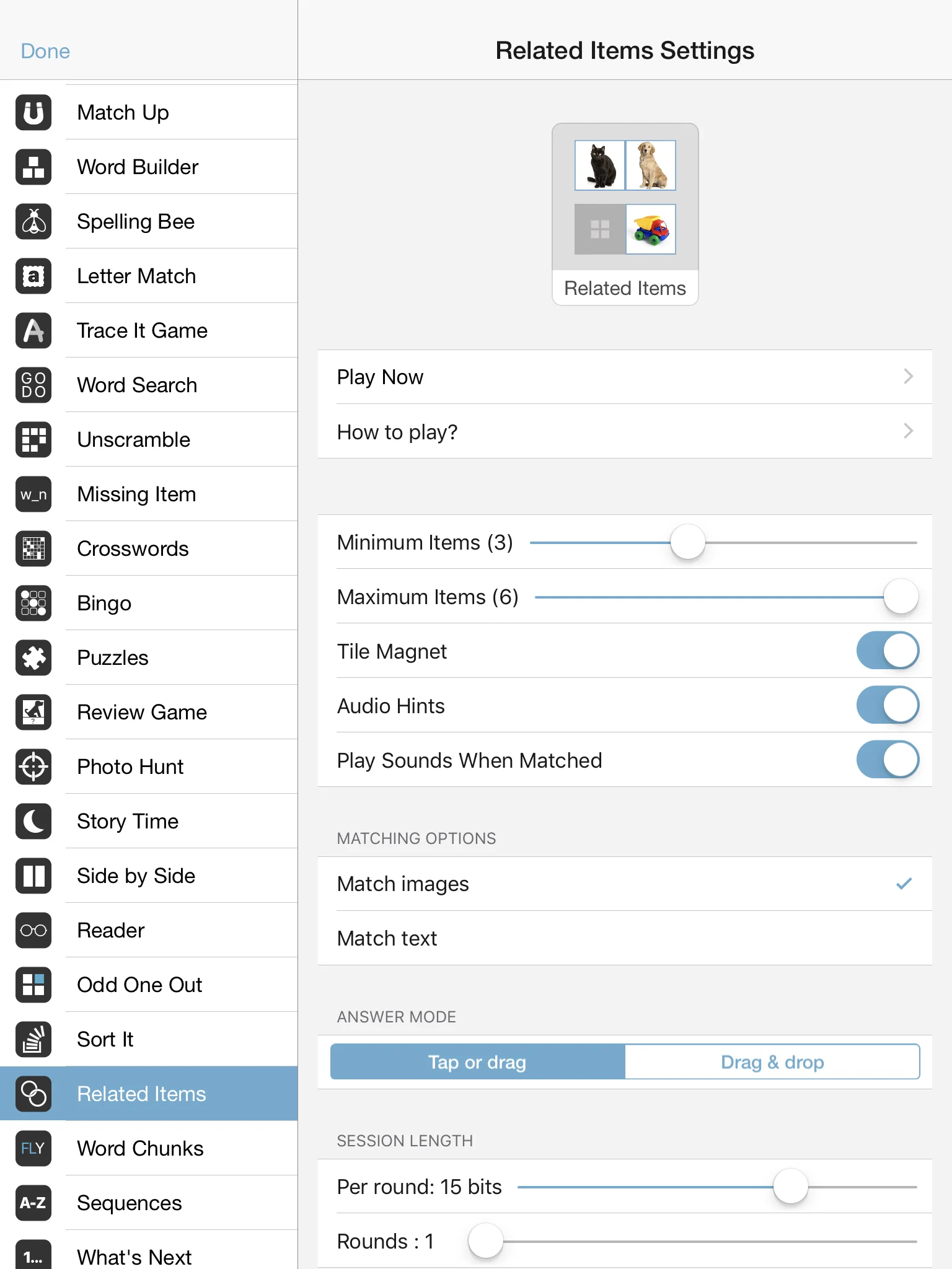 The Related Items game enables you to create some really fun and exciting logic games with Bitsboard. Here are a couple of examples of popular "Related Items" games.