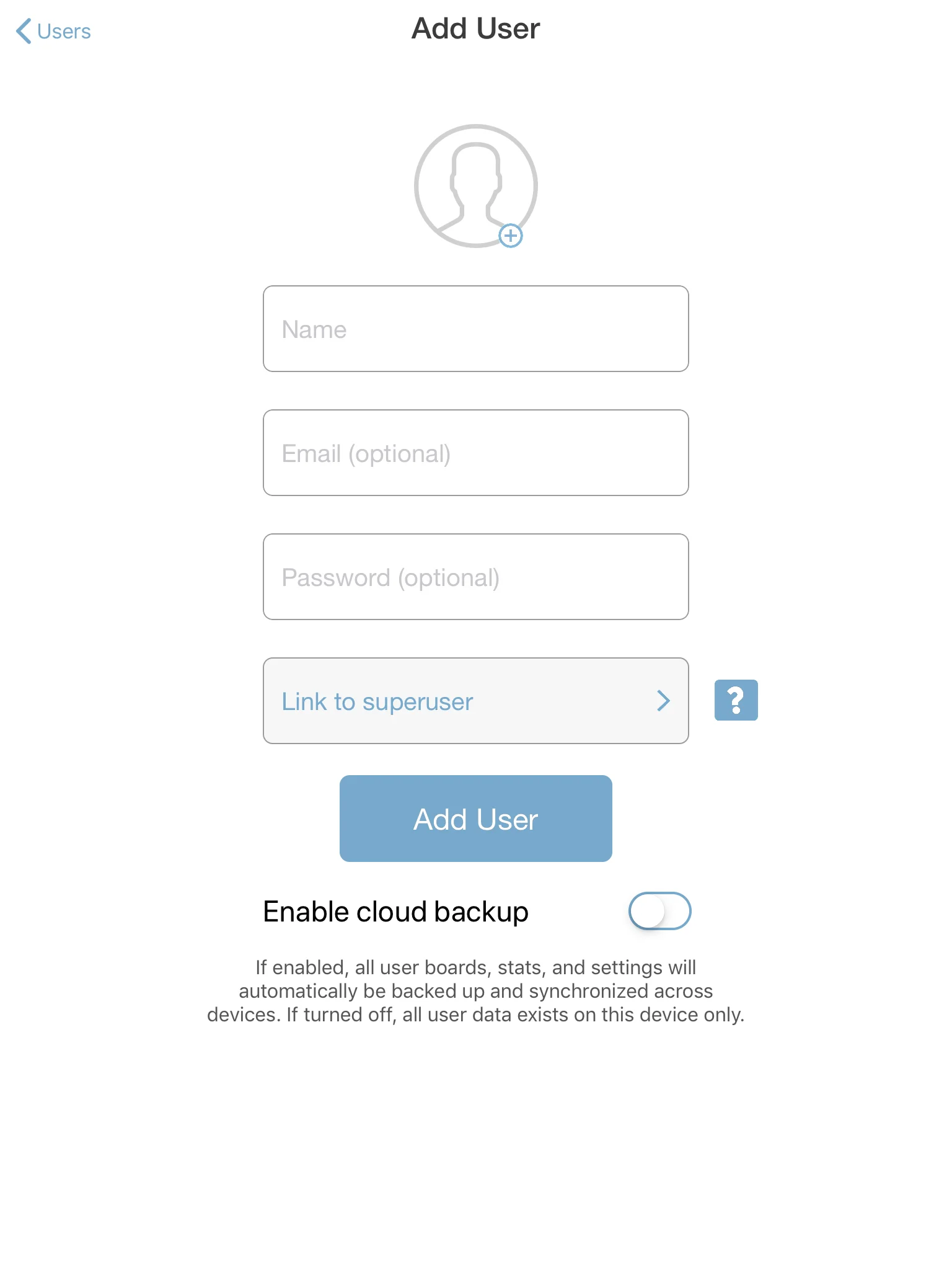 A local user account is great for adding your kids or your students because you don't need to add any email or password. However, be sure to link local accounts to a superuser if you want to backup their boards, settings, and user stats. Otherwise there is no way to recover data from a local user account.