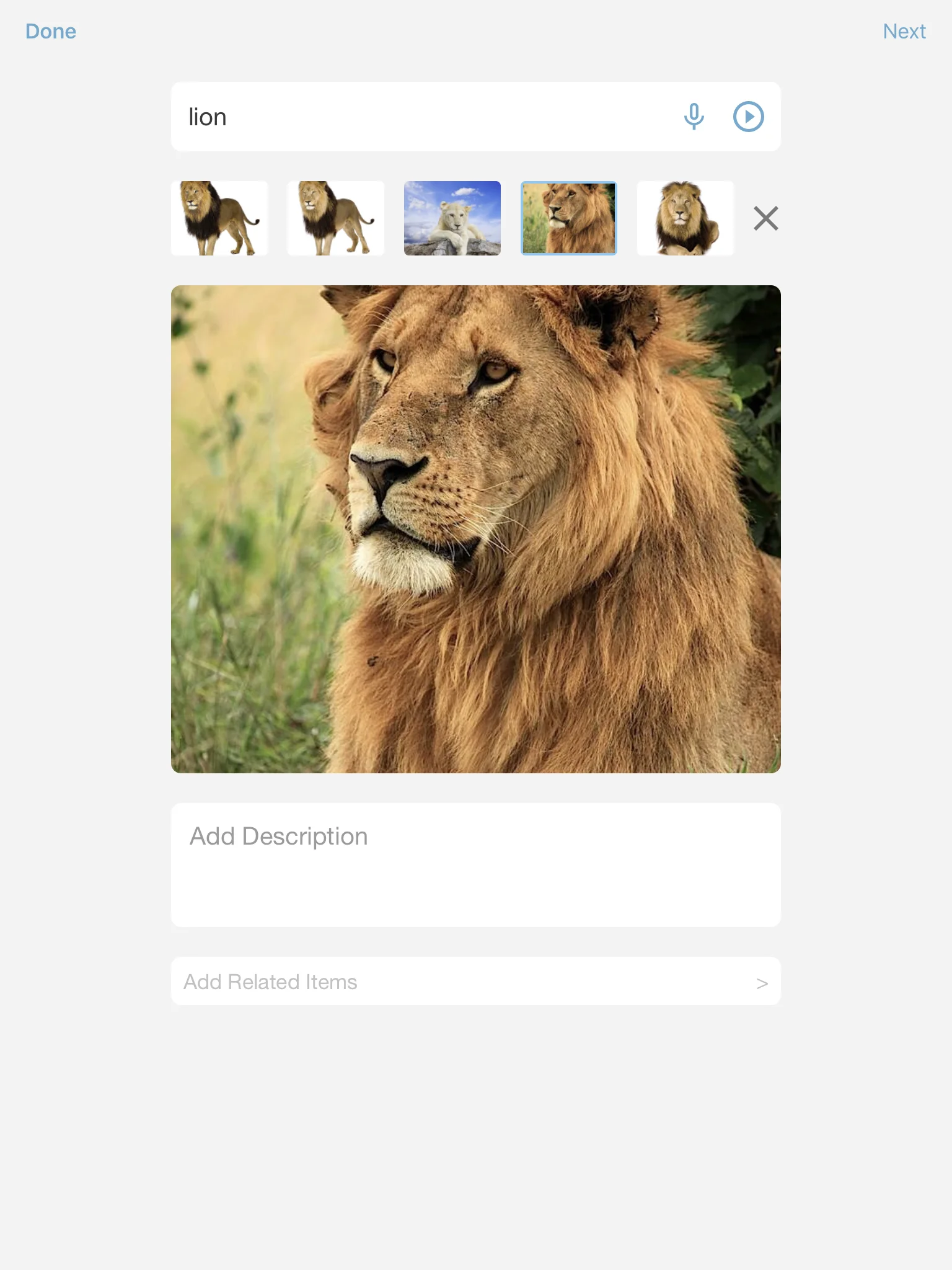 The first step when creating a new card is to add the label (i.e. word, phrase, or sentence) such as "lion." As soon as you press "done" or close the keyboard, Bitsboard will load a series of suggested images. This is where the magic starts because the image suggestions in Bitsboard are of stunning quality and they appear almost instantly!