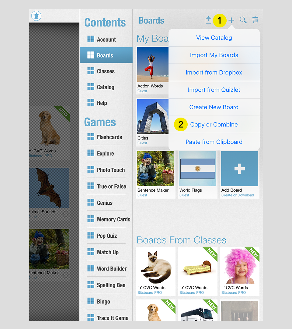 To copy or combine entire boards, first go to Settings > Boards and press on the "+" button to add a new board. From the dropdown menu, select "Copy or Combine"