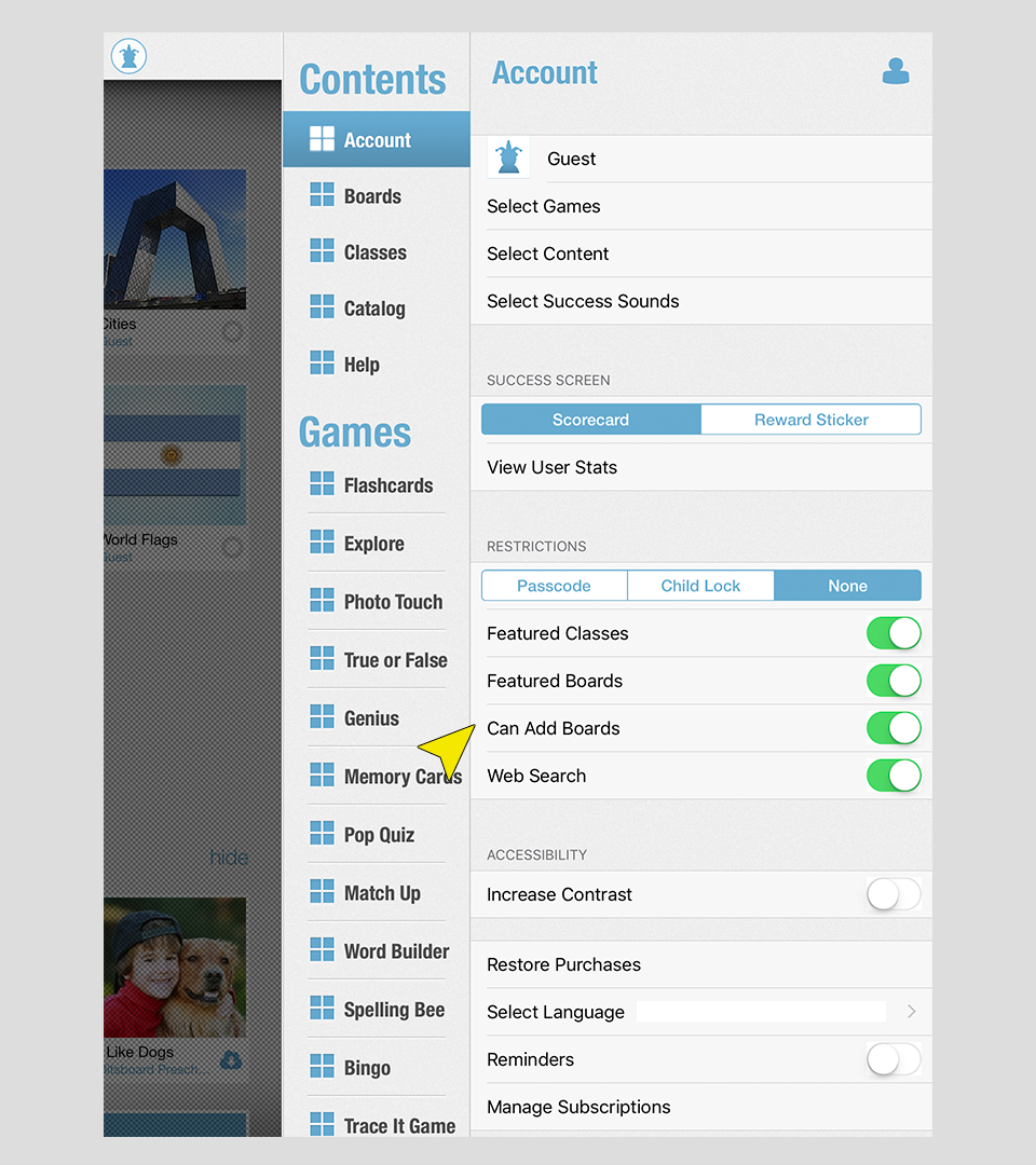 This is a great little addition especially for kids that get easily distracted. It also allows you to present a main screen to your child that looks clean and uncluttered and just keeps them focused on the boards that you would like to work on. See the image below on how to turn this feature off.