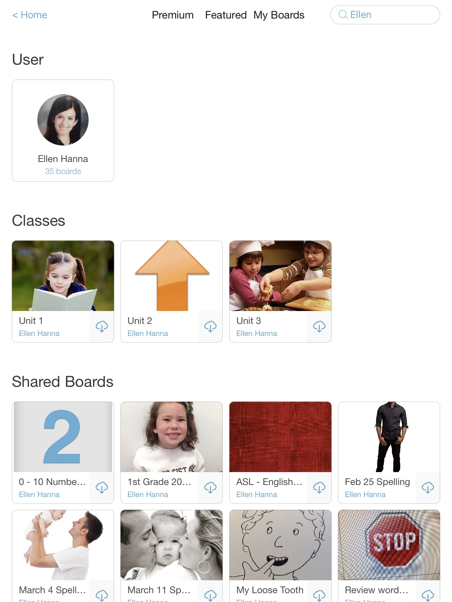 IMPORTANT: Be sure to give your board and username a unique name to make it easier to find. In the example below, we searched for the user “Ellen” and then selected the user profile for “Ellen Hanna” to see all of the boards and classes this user has shared.