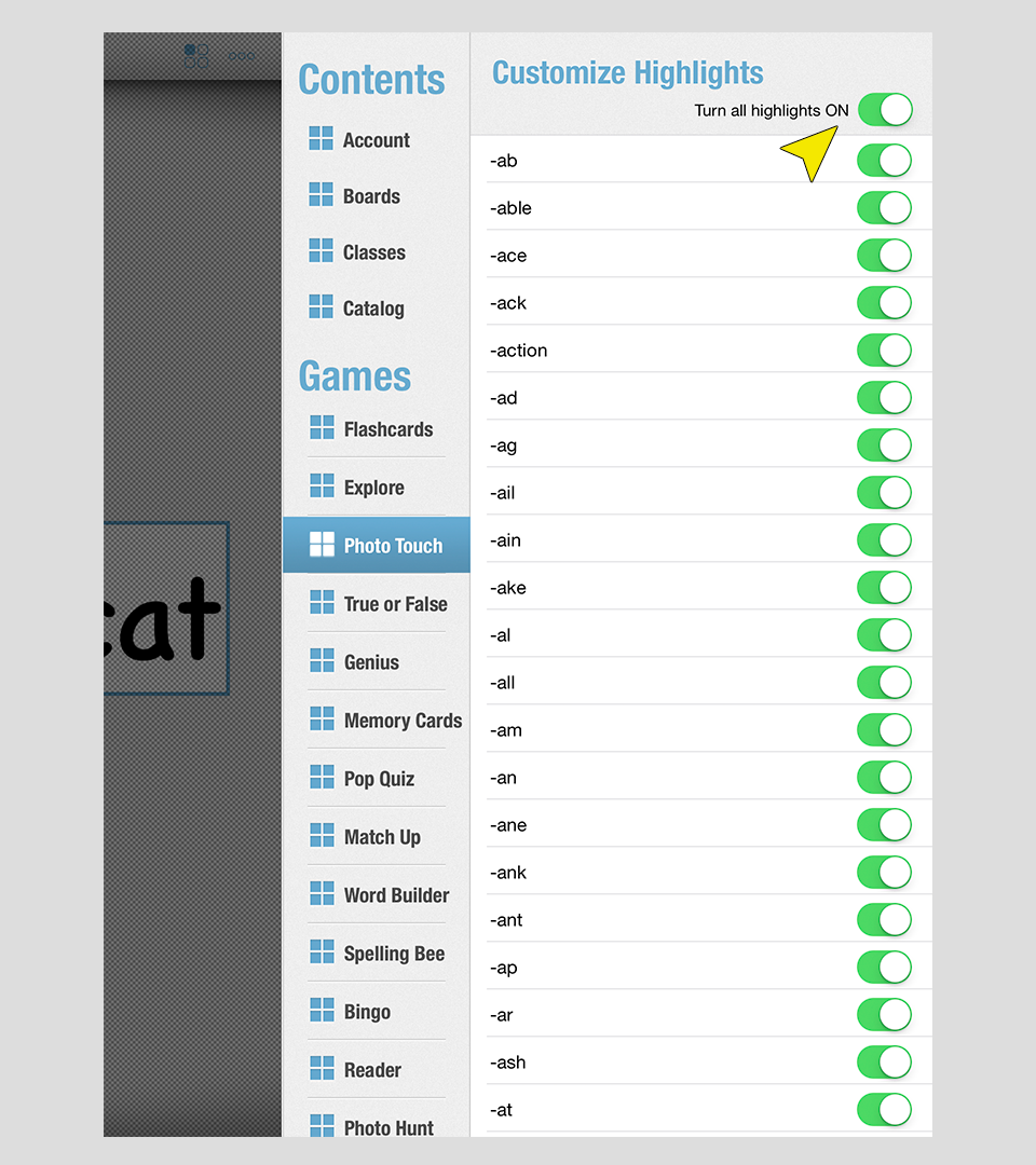 A lot of teachers like to use the highlights feature to help students focus / recognize certain phonetic sounds that make up a word. The highlights feature is supported by the Flashcards, Photo Touch, Match Up, Reader, Spelling Bee, and Related Items games.